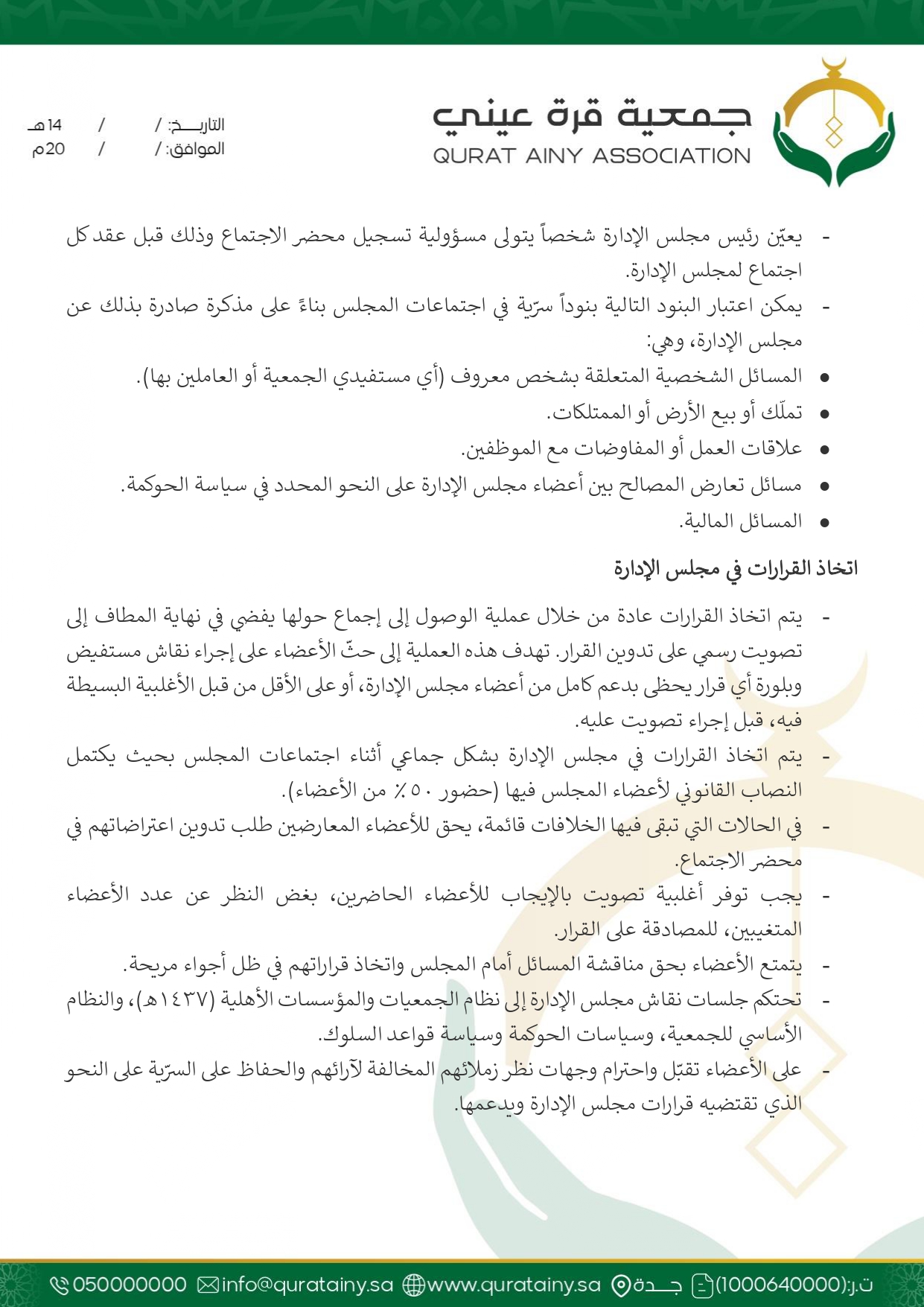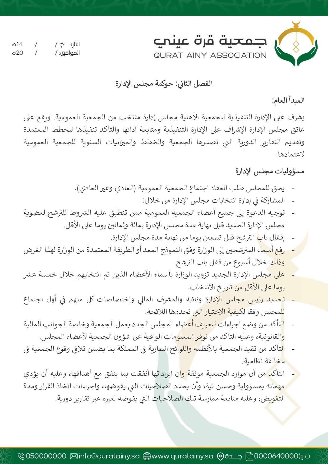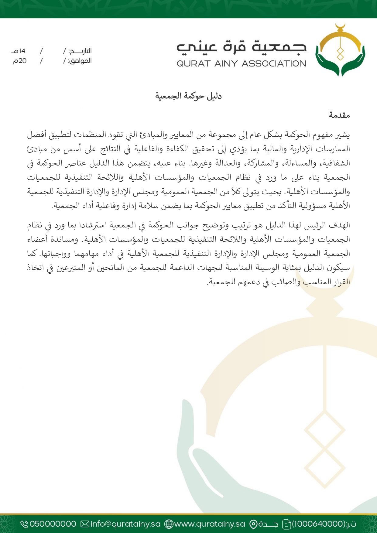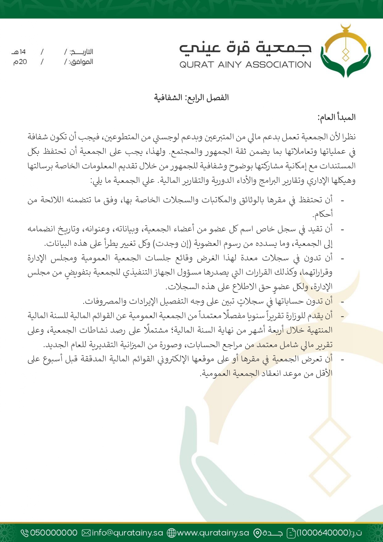 تلتزم جمعية قُرّة عيني بتطبيق أعلى معايير الحوكمة والشفافية، وضمان الامتثال للأنظمة واللوائح بما يعزّز سلامة العمل ويحقق استدامة الأثر في خدمة بيوت الله والمصلين.