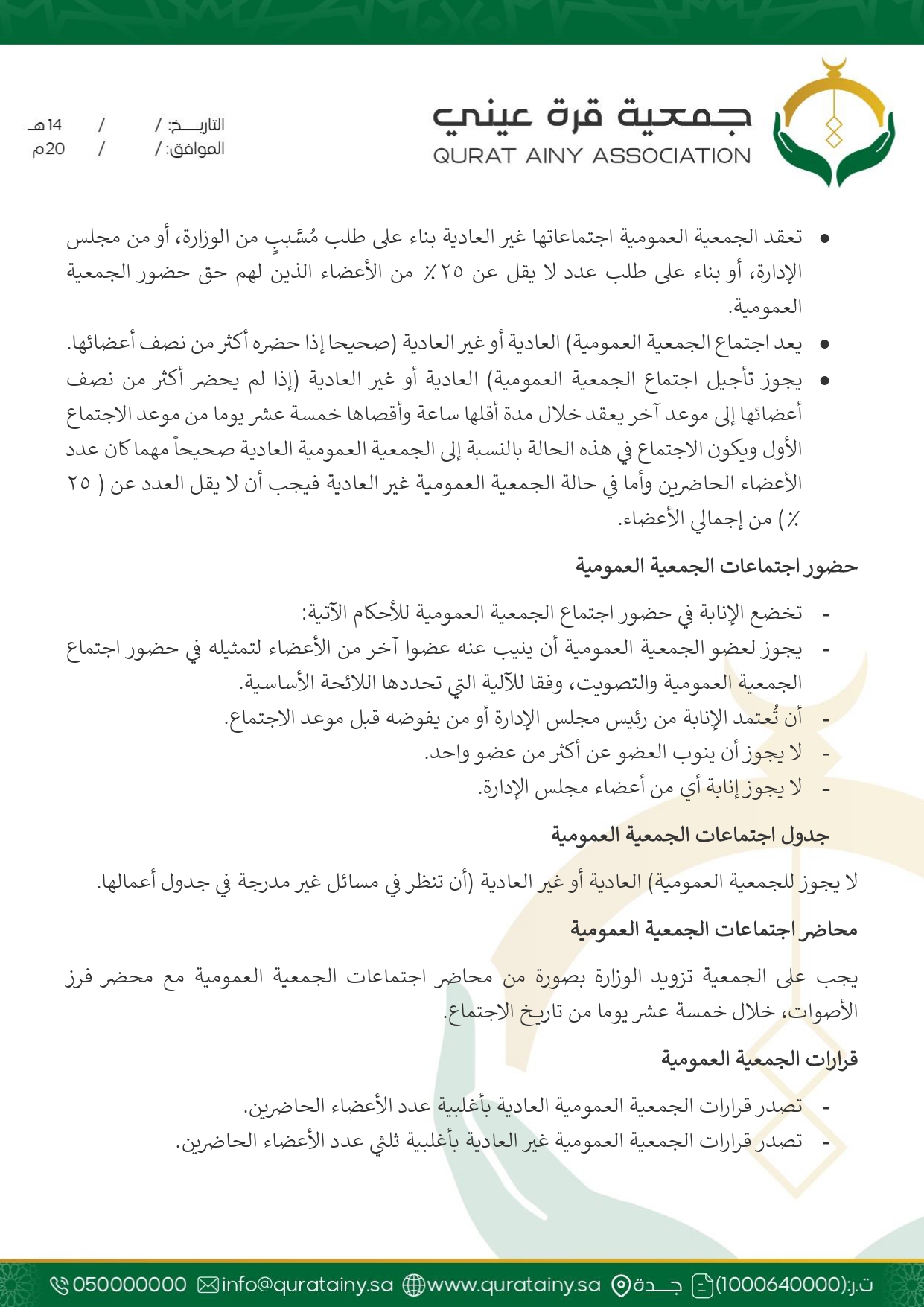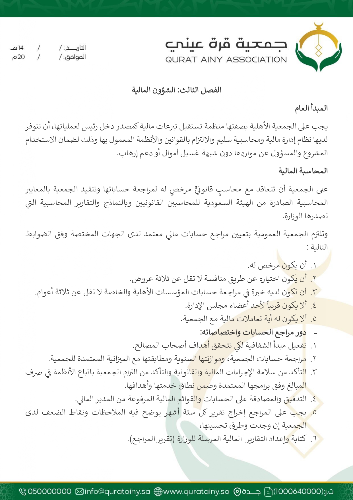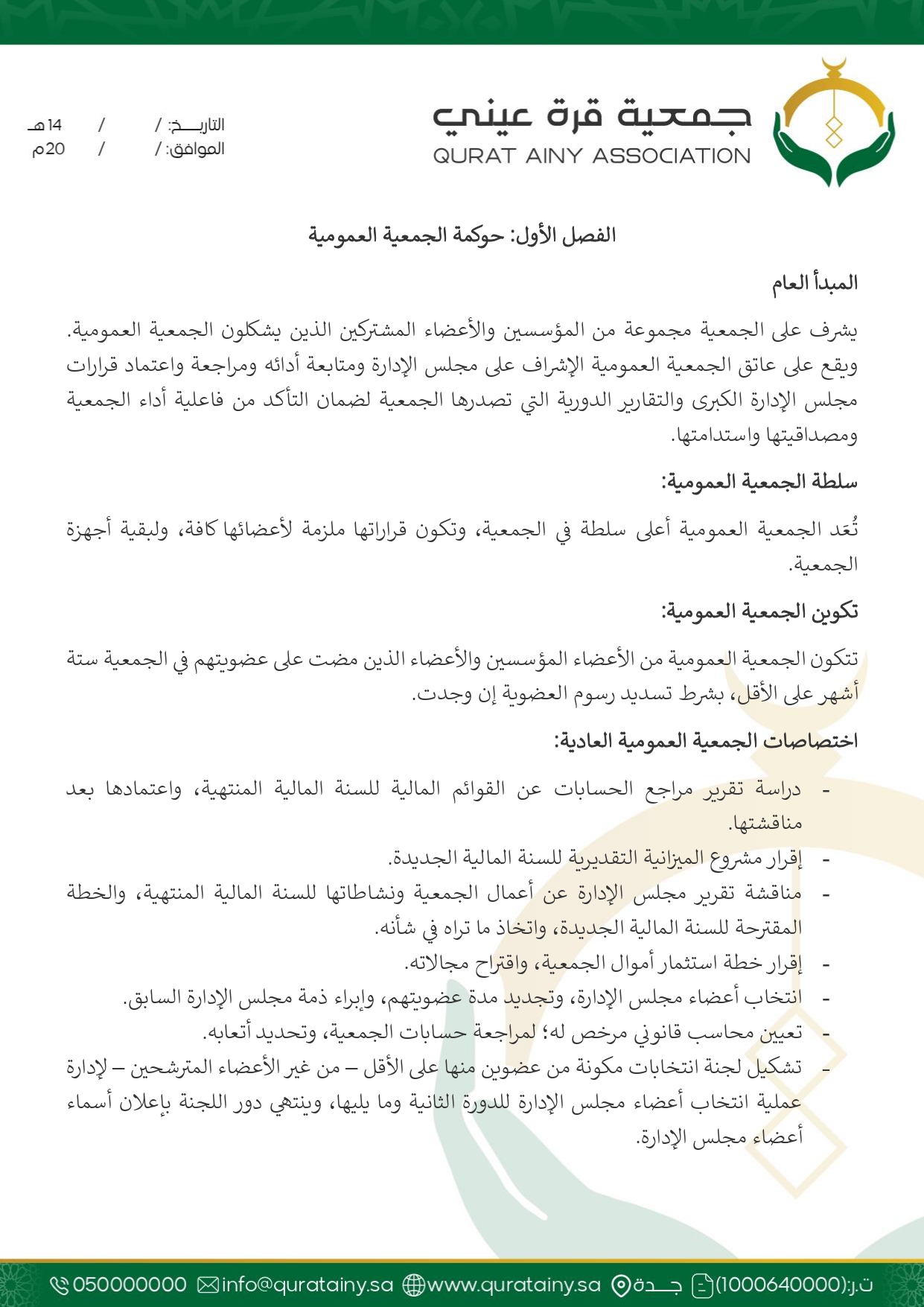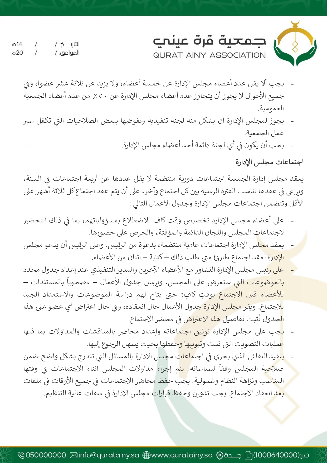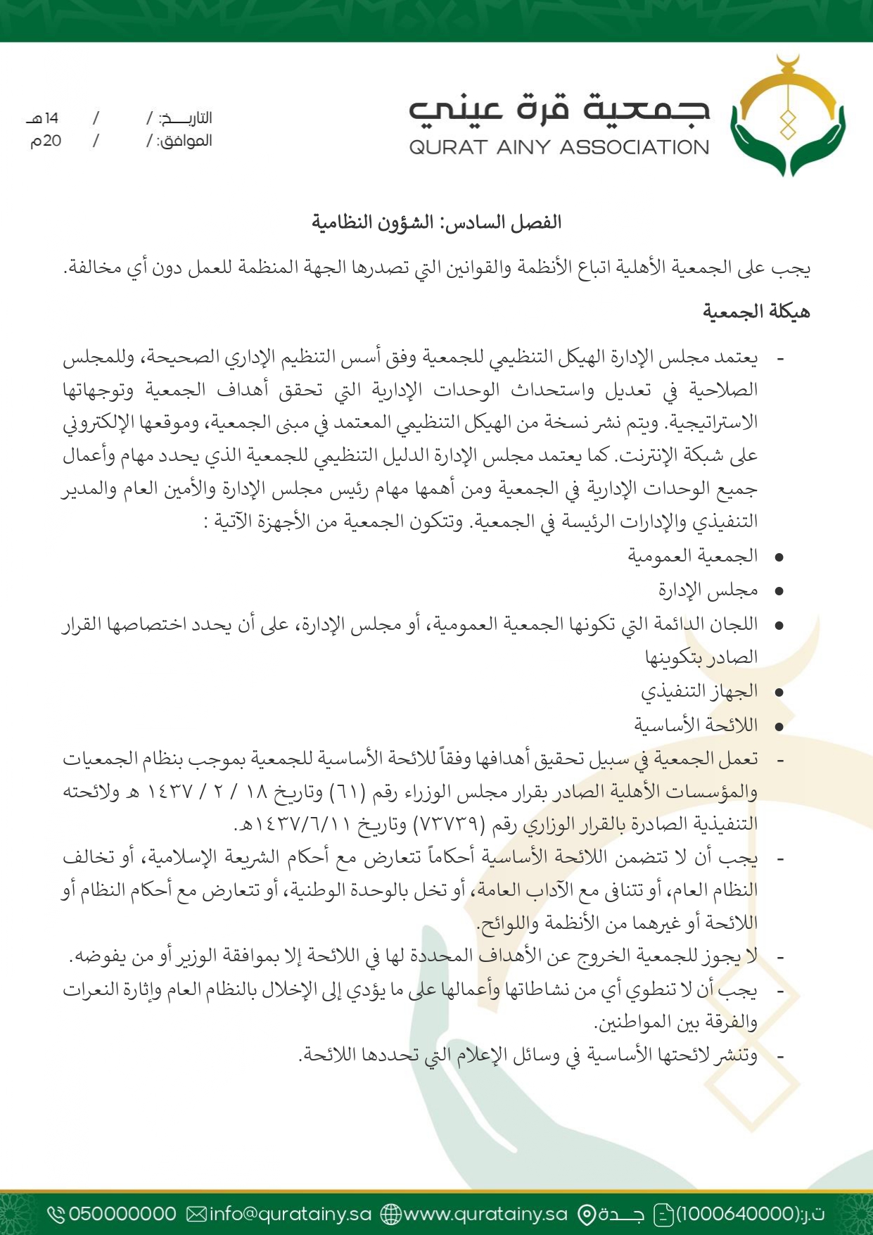 تلتزم جمعية قُرّة عيني بتطبيق أعلى معايير الحوكمة والشفافية، وضمان الامتثال للأنظمة واللوائح بما يعزّز سلامة العمل ويحقق استدامة الأثر في خدمة بيوت الله والمصلين.