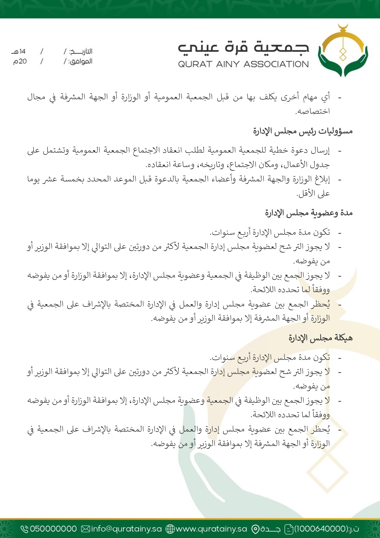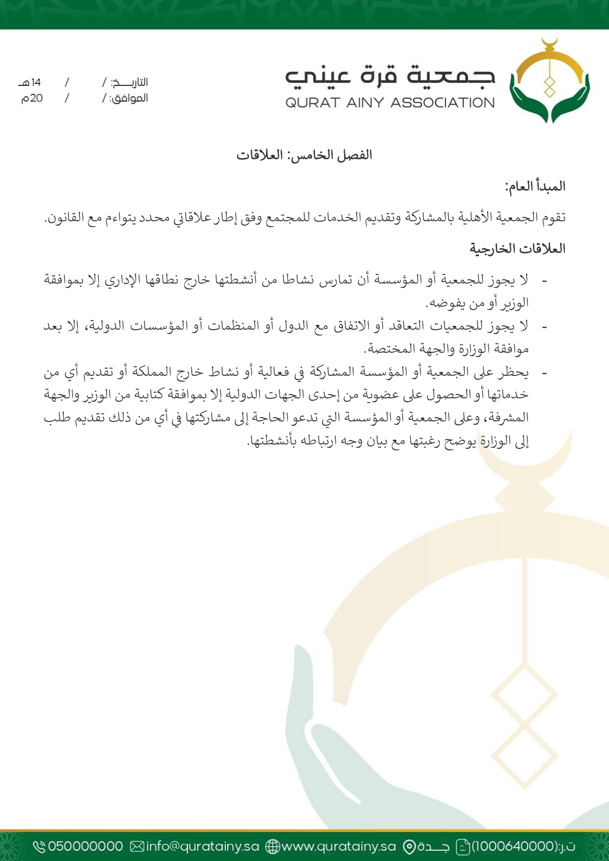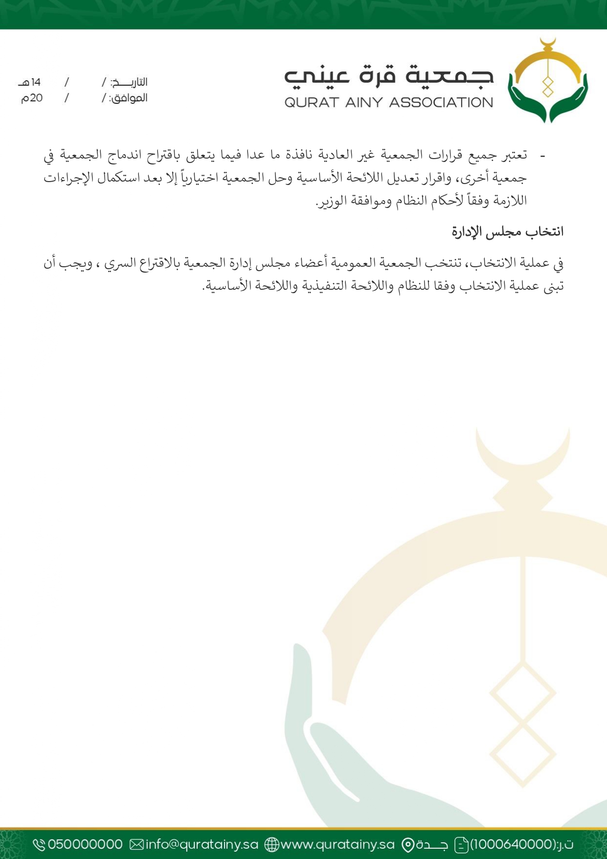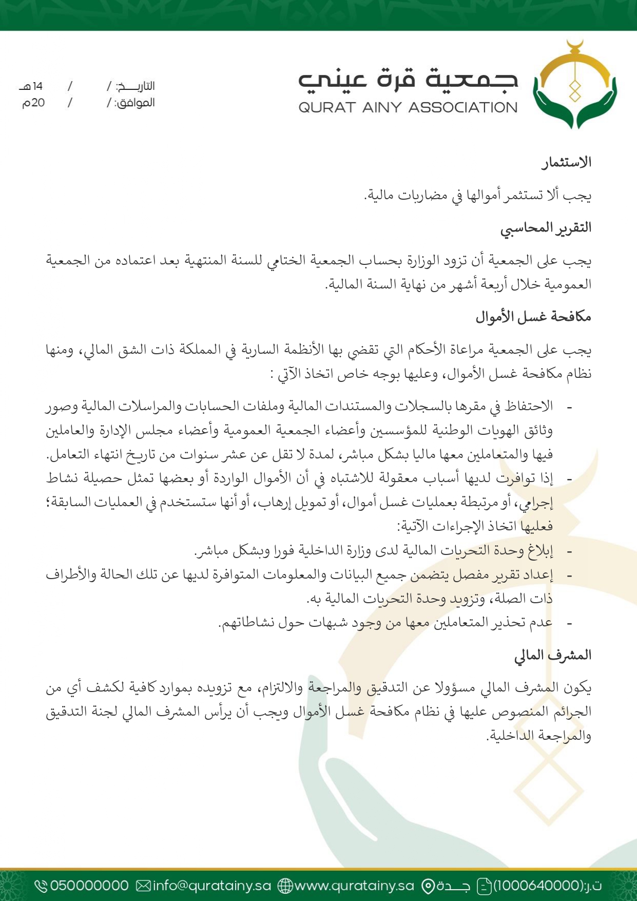 تلتزم جمعية قُرّة عيني بتطبيق أعلى معايير الحوكمة والشفافية، وضمان الامتثال للأنظمة واللوائح بما يعزّز سلامة العمل ويحقق استدامة الأثر في خدمة بيوت الله والمصلين.